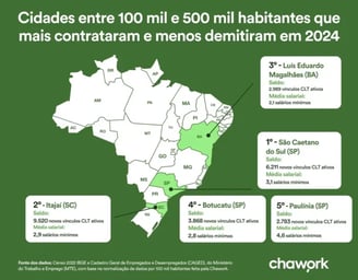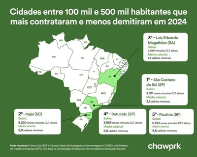 O CAGED, atualizado mensalmente, coleta informações sobre contratações e demissões em empresas que operam sob o regime CLT em todo o Brasil, e o estudo desenvolvido pela Chawork considerou o saldo de empregos, que representa a diferença entre admissões e desligamentos.